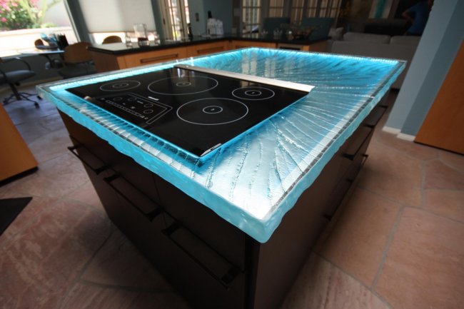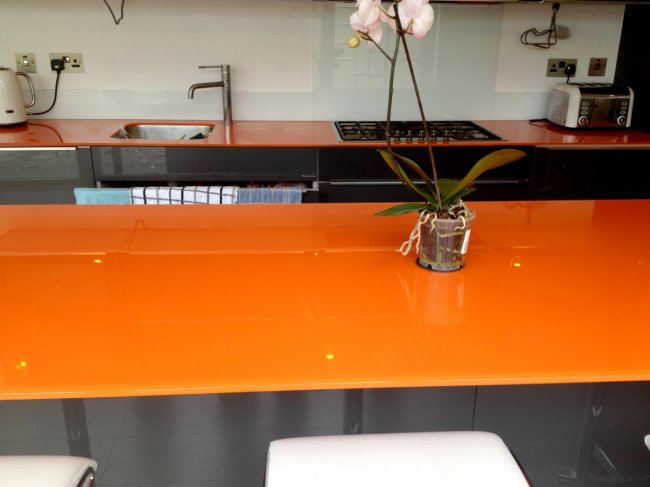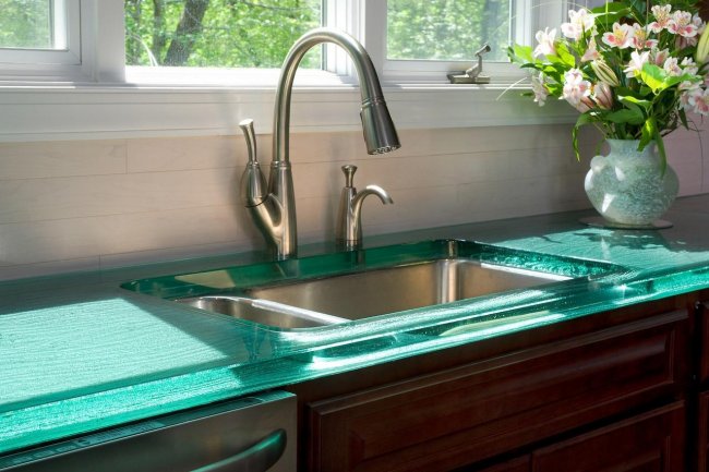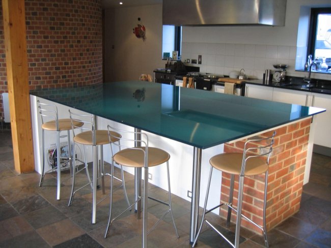 Такие столешницы могут иметь очень оригинальный и необычный внешний вид, поскольку на стекло можно нанести любой орнамент, роспись, даже фотопечать.