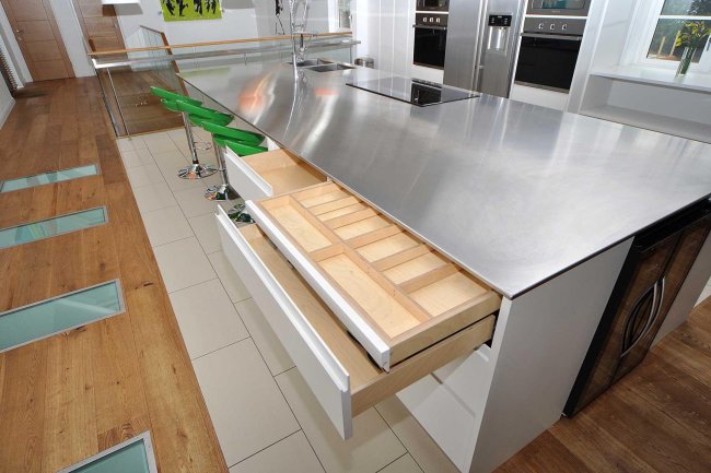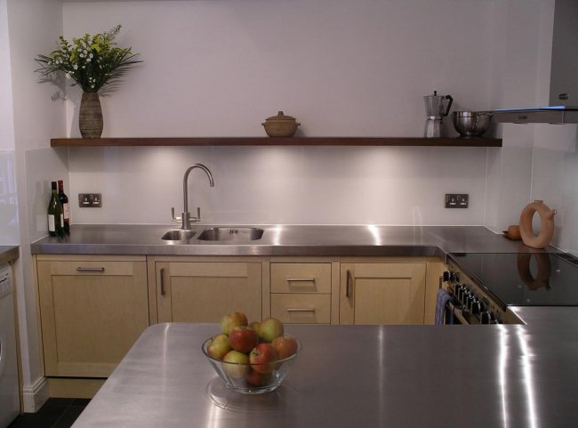 В этом случае стальной лист толщиной 0,8 мм накладывают на лист ДСП, а края загибают на специальном прессе, заваривают, шлифуют. Такие столешницы долговечны, очень устойчивы к влаге, различным моющим средствам, к механическим повреждениям, но стоит учитывать, что постепенно металл может потускнеть, да и отпечатки пальцев портят внешний вид.