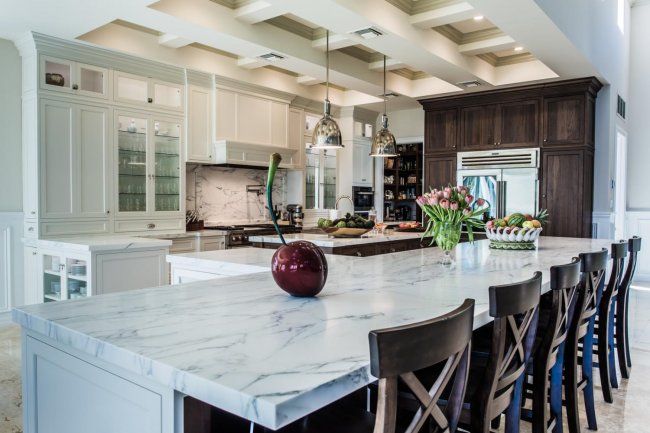 Каменные столешницы имеют наиболее высокую цену, но при этом станут прекрасным дополнением любого интерьера, устойчивы к влаге, температурным перепадам, царапинам, истиранию, ударам, а шлифовка позволяет вернуть столешнице изначальный вид.