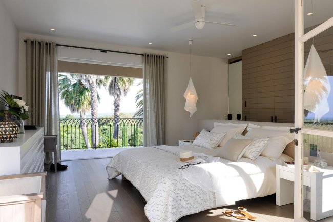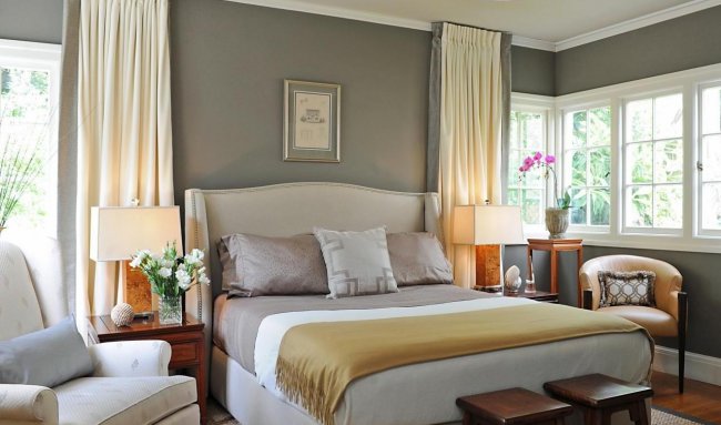 Дизайн спальни со светлой мебелью выигрывает при таких цветовых оттенках: