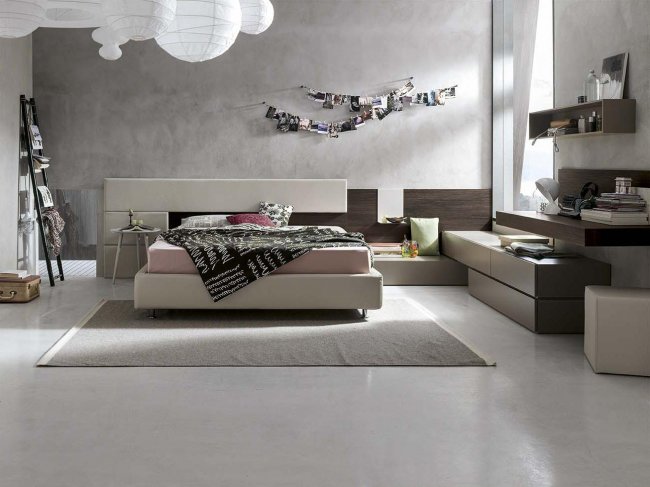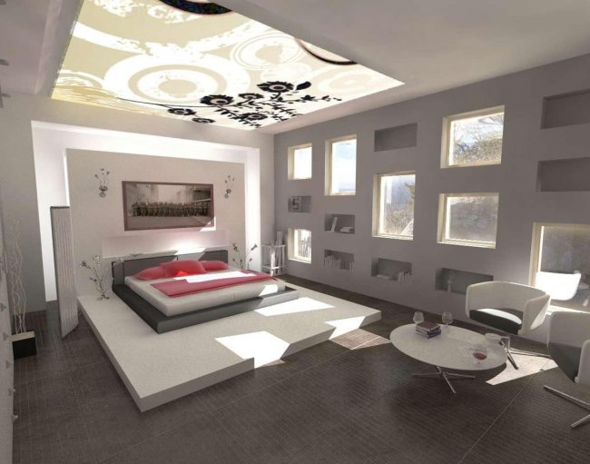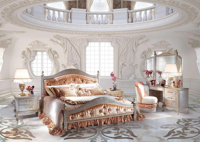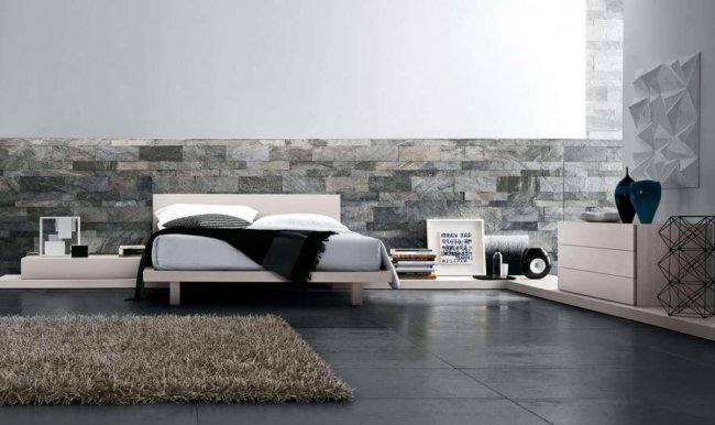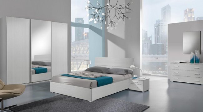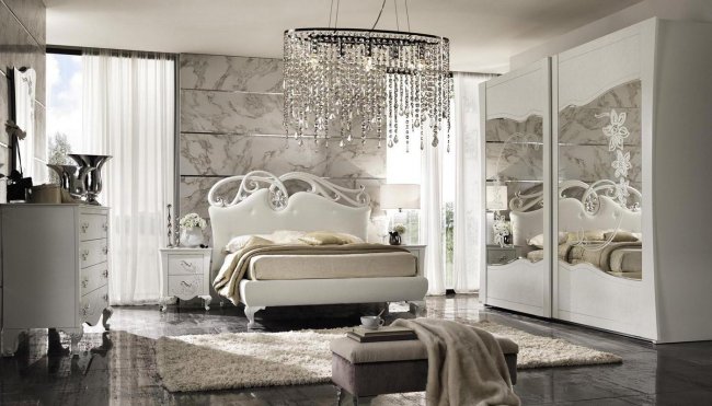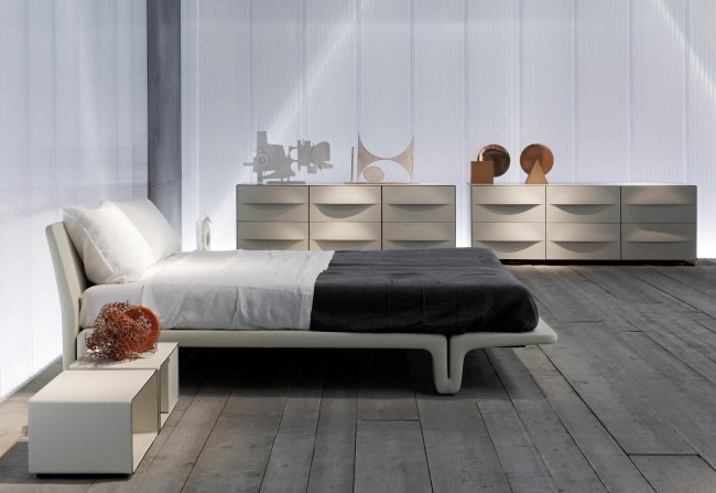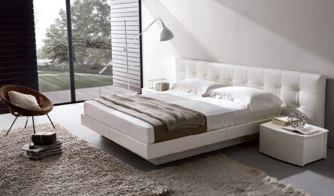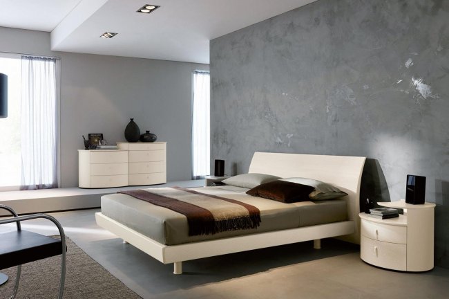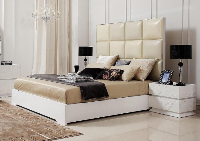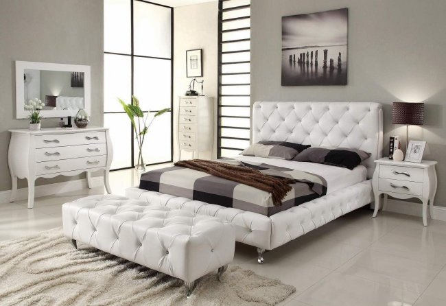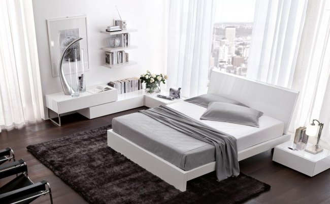 Интерьер спальни со светлой мебелью носит черты минимализма. Комната должна вмещать минимум предметов и больше отражающих (глянцевых, зеркальных) поверхностей. Изюминкой в оформлении спальни становится кровать. Ее высокое изголовье способно исполнить роль своеобразного цветового фокуса. Размещенные рядом по принципу контраста прикроватные тумбочки разнообразят интерьер.