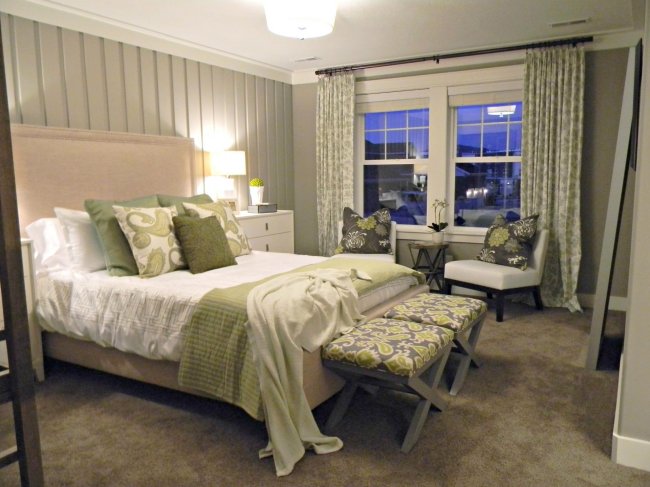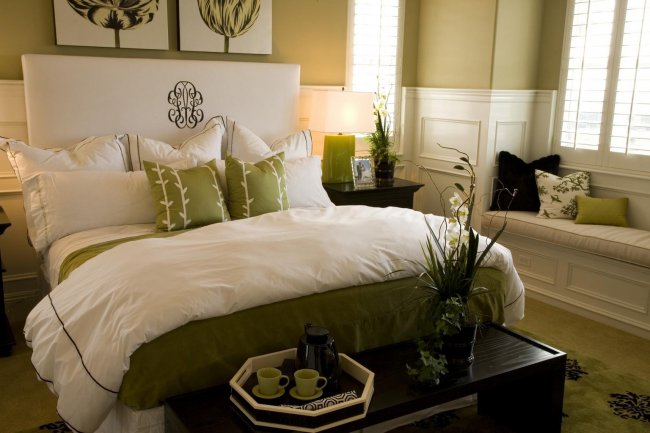 3В оформлении спальни преобладает бело-зеленая цветовая гамма. Свежесть колорита добавляется обилием живых цветов.