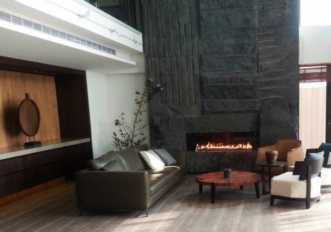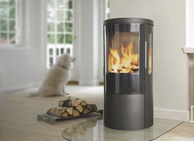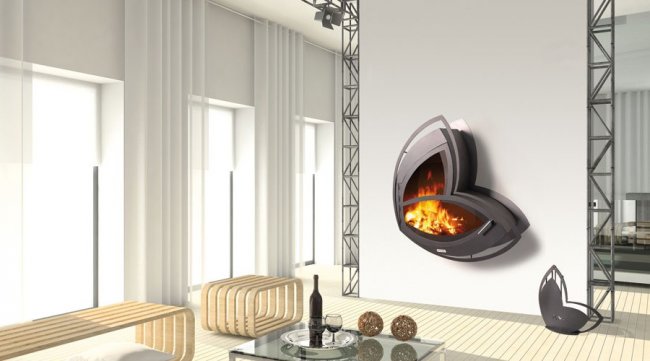 Эффектнее всего смотрится с панорамной открытой или закрытой топкой, позволяющей любоваться горящим огнем со всех сторон.