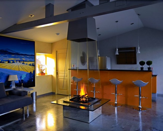- Так как островной камин занимает много места, его лучше устанавливать в просторных помещениях: в интерьере современной гостиной или холла, а также применять при зонировании.
