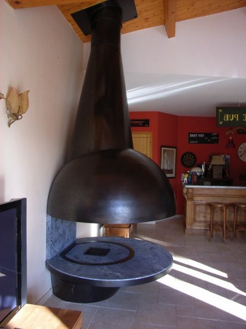 - Камин, установленный в совмещенной кухне-столовой, может выполнять также кулинарную функцию. Оборудованный решеткой для барбекю, секциями-держателями или грилем, он позволяет готовить пищу на открытом огне.