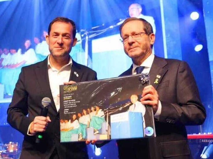 На фото: Президент Герцог на праздновании 50-летия поселенческого движения в Самарии получает от Йоси Дагана фотографию своего отца, президента Хаима Герцога, сделанную на праздновании 10-летия поселенческого движения в Самарии 40 лет назад.