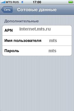 - точка доступа, она же APN — internet.mts.ru;