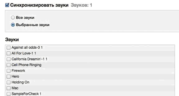 - затем необходимо перейти во вкладку «Звуки» и отметить пункт «Синхронизировать звуки»;