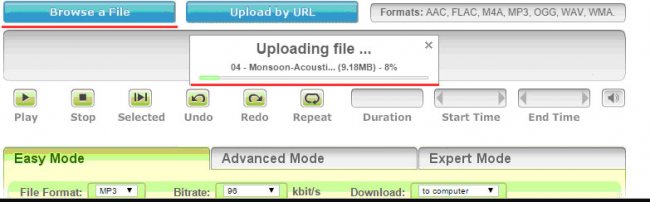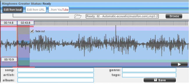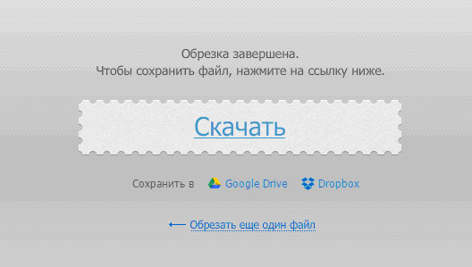 - после того, как нужный файл был выбран, на странице появится окно, где можно обрезать файл до нужного временного интервала, а также добавить плавное начало и затухание в трек;