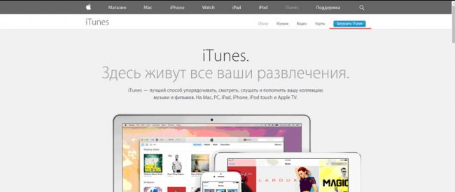 - если itunesне установлена на компьютере, ее необходимо скачать, перейдя по этой ссылке http://www.apple.com/ru/itunes/. Перейдя на страницу программы необходимо кликнуть на вкладку «Загрузить iTunes» и начнется процесс загрузки. После того, как программа загрузилась, ее необходимо установить;