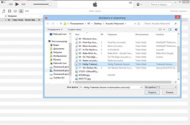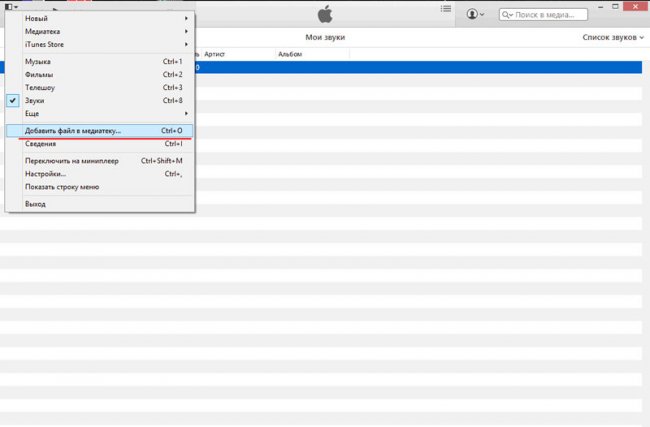 - теперь необходимо запустить iTunesи добавить нужный трек в медиатеку. Чтобы добавить трек в медиатеку, необходимо кликнуть на «Добавить файл в медиатеку»;