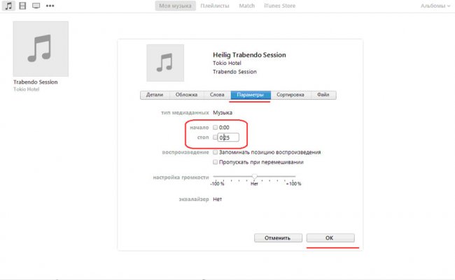 - затем в окне «Сведения о песне», перейдя во вкладку «Параметры» в пунктах «начало» и «стоп», необходимо указать временной промежуток, который будет использован в рингтоне;